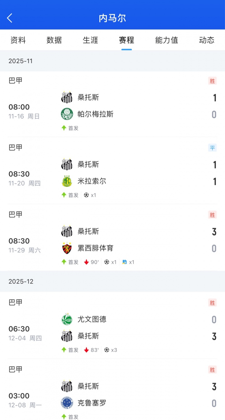 最后6轮,内马尔仅伤缺1场,其余5场全部首发并且几乎打满(5场443分钟),贡献5球1助攻,成功帮助母队保级!